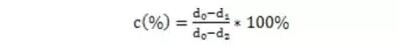 密封圈在壓縮狀態(tài)時,必然會發(fā)生物理變化和化學變化。當壓縮力消失后,這些變化阻止橡膠恢復到期原來的狀態(tài),于是就產生了壓縮永久變形。壓縮永久變形性能涉及到橡膠的彈性與恢復,是衡量橡膠制品密封性能的好壞及使用壽命長短的重要指標之一。壓縮永久變形率c(%)按式(2)計算[6]: