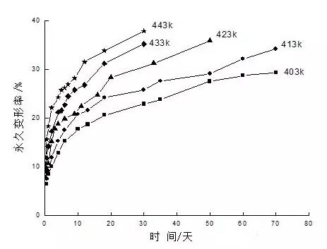 由高溫加速老化試驗所測得的永久變形率和時間的關系如圖4所示。